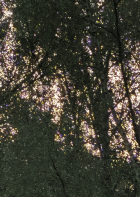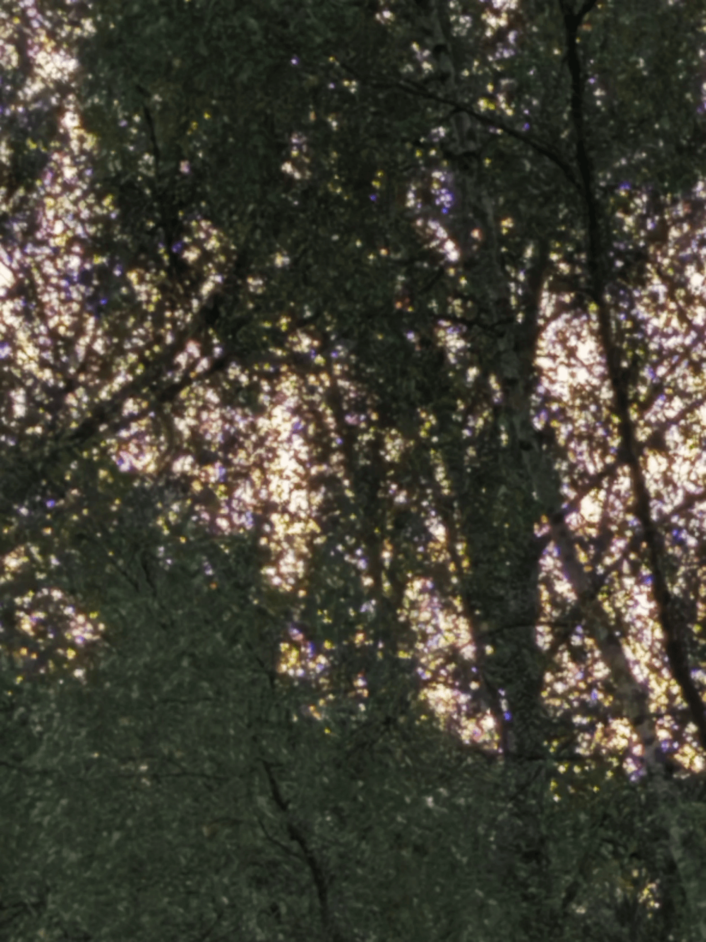 Taking a picture of a tree last summer, I was moved to find how sunlight passing through its leaves can break into a spectrum of colours when caught by a phone camera. Produced through the interaction between light, lens, and sensor, this optical glitch reveals a scene otherwise invisible to the naked eye.